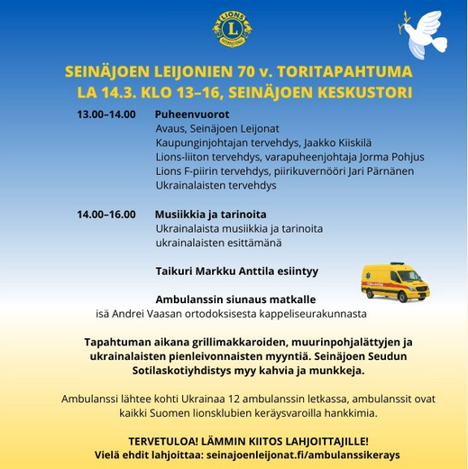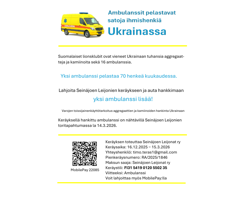 Seinäjoen alueen lionsklubit (Seinäjoen Leijonat) järjestävät Ambulanssi Ukrainaan -keräyksen ajalla 16.12.25-15.3.2026. Pienkeräysnumero: RA/2025/1846.