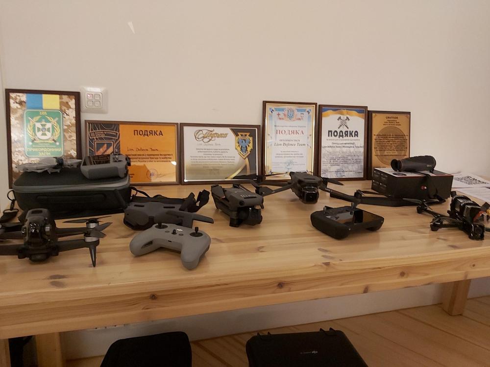 Nykyaikaisia drooneja ja yhdistyksen saamia kunniakirjoja.