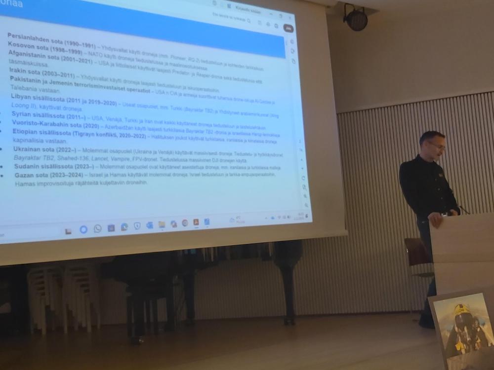 Toisen osan luennosta piti niin ikään hallituksen jäsen, perustajajäsen Pasi Rajamäki. Hänen aiheenaan oli: Dronesodankäynti, suojautumis- ja vastatoimet sekä miehittämättömien laitteiden koulutus- ja tuotantotarpeet.